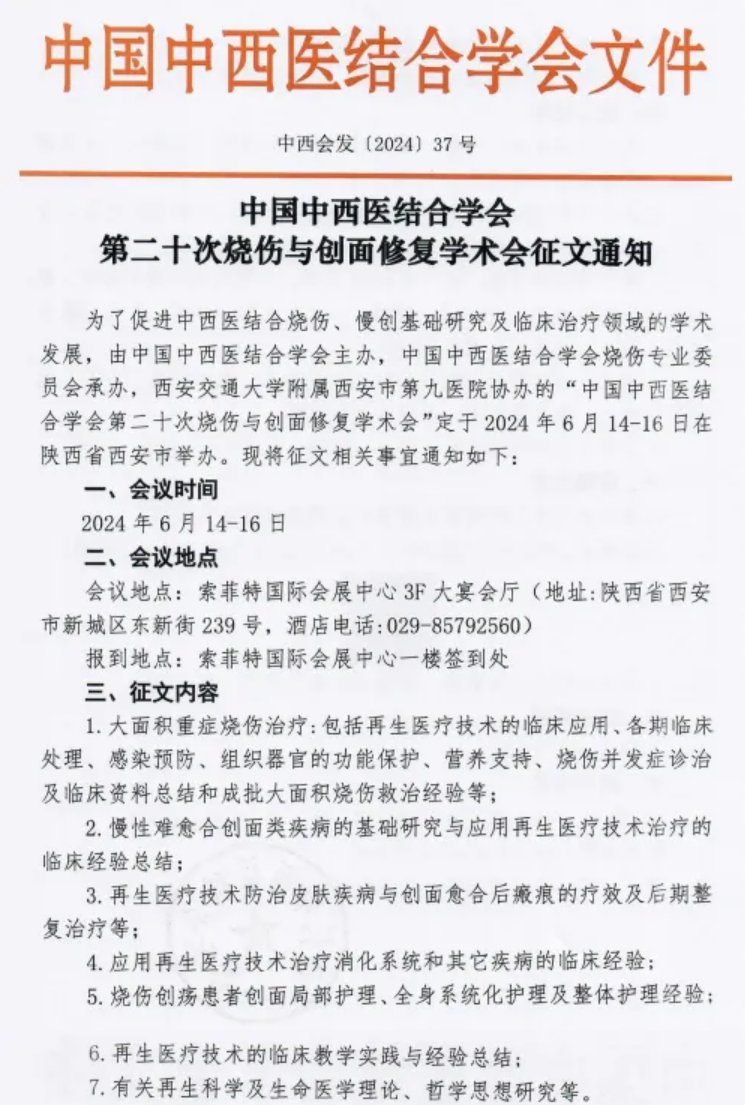 由中国中西医结合学会主办,中国中西医结合学会烧伤专业委员会承办,西安交通大学附属西安市第九医院协办的“中国中西医结合学会第二十次烧伤与创面修复学术会议”将于2024年6月14—16日在陕西省西安市召开。